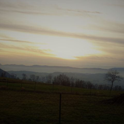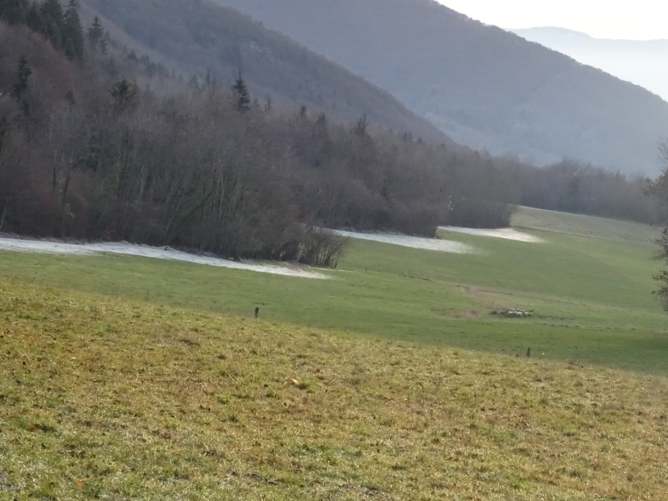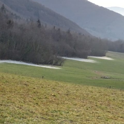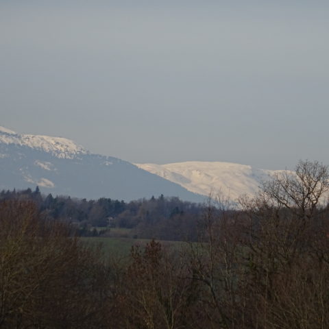 À l’orée du bois, on aperçoit le lieudit à droite mais bifurcation à gauche, retour vers la Mandallaz que l’on rejoint par le « sentier du tour de la Mandallaz », poursuite jusqu’à Rosières et descente à travers champ, jusqu’au stade.