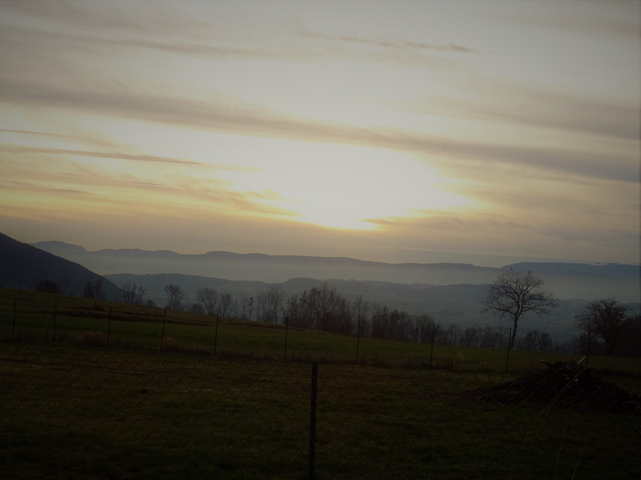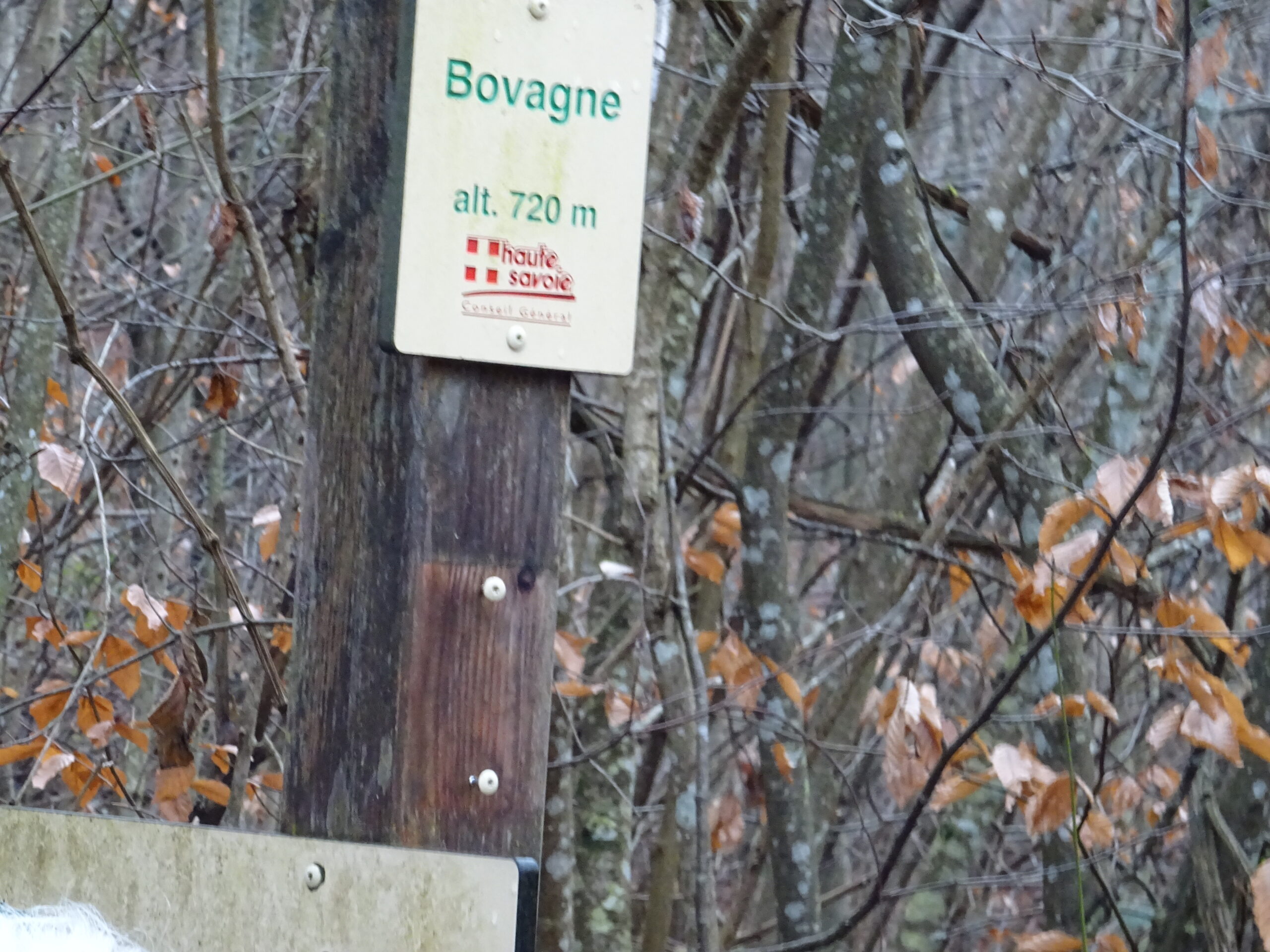 Départ du stade de Choisy, direction la Combes. De là on quitte la commune de Choisy, traversée du champ qui borde la Mandallaz, puis descente en direction du vieux chêne, à travers bois, chemin caillouteux, couvert de feuilles mortes trempées .