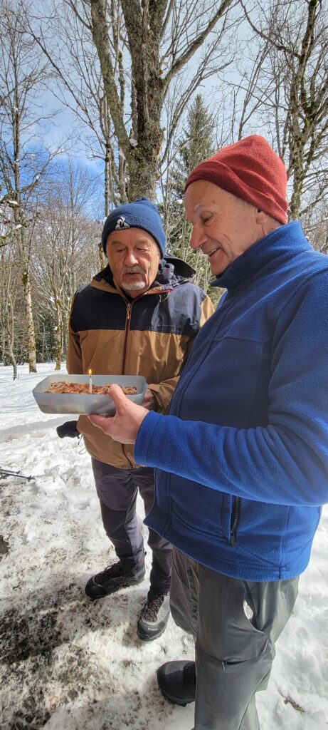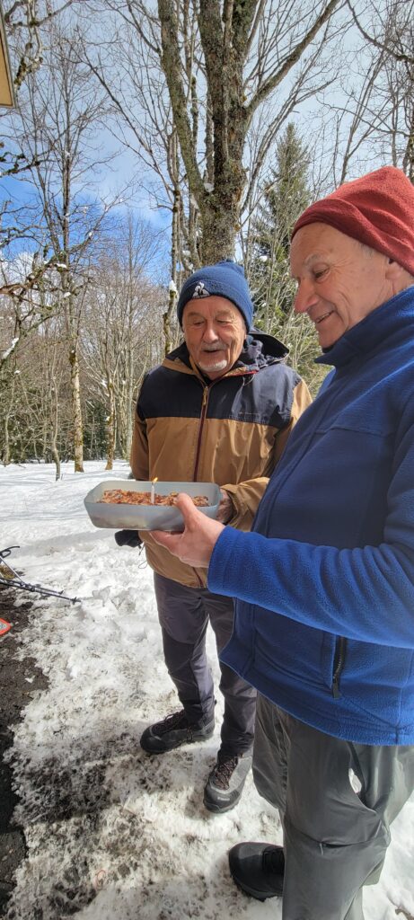 Bulles et jambon en apéro, gâteaux et douceurs en guise de déssert . Nadine a remplacé Brigitte  pour que  Claude et Jean Louis soufflent la traditionnelle bougie d’anniversaire.Nous avons trinqués à la  santé de tous les  présents et absents.
