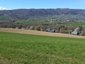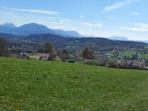 belles prairies; belles vues sur le décor environnant: Parmelan , Semnoz, Salève, Bauges au loin et lac D’Annecy.