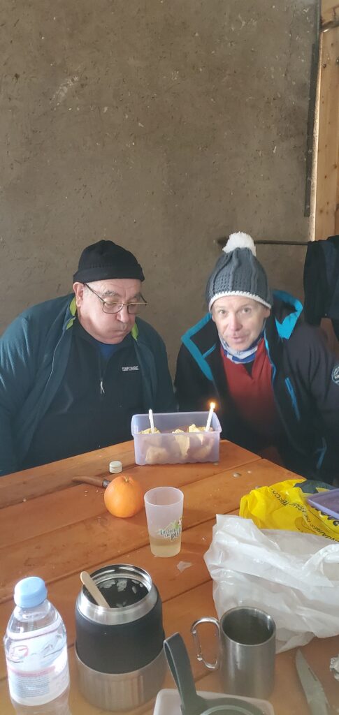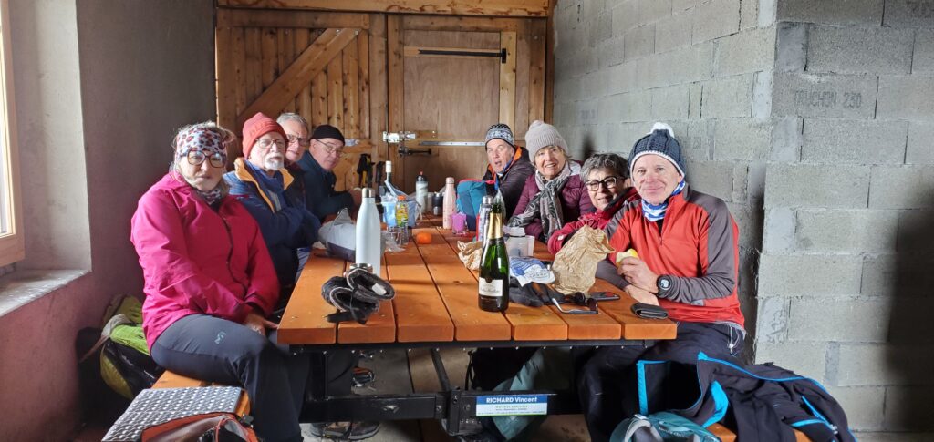 Pause pique-nique dans la salle hors sac de Lathuile où nous avons dégusté en apéritif truite et saumon fumé de Joseph arrosé de vin d’Auxerre et du champagne de Philippe, tout ceci avec modération mais pour la bonne cause puisque nous fêtions leurs anniversaires, gâteau de Joëlle et bougie de Brigitte pour compléter .