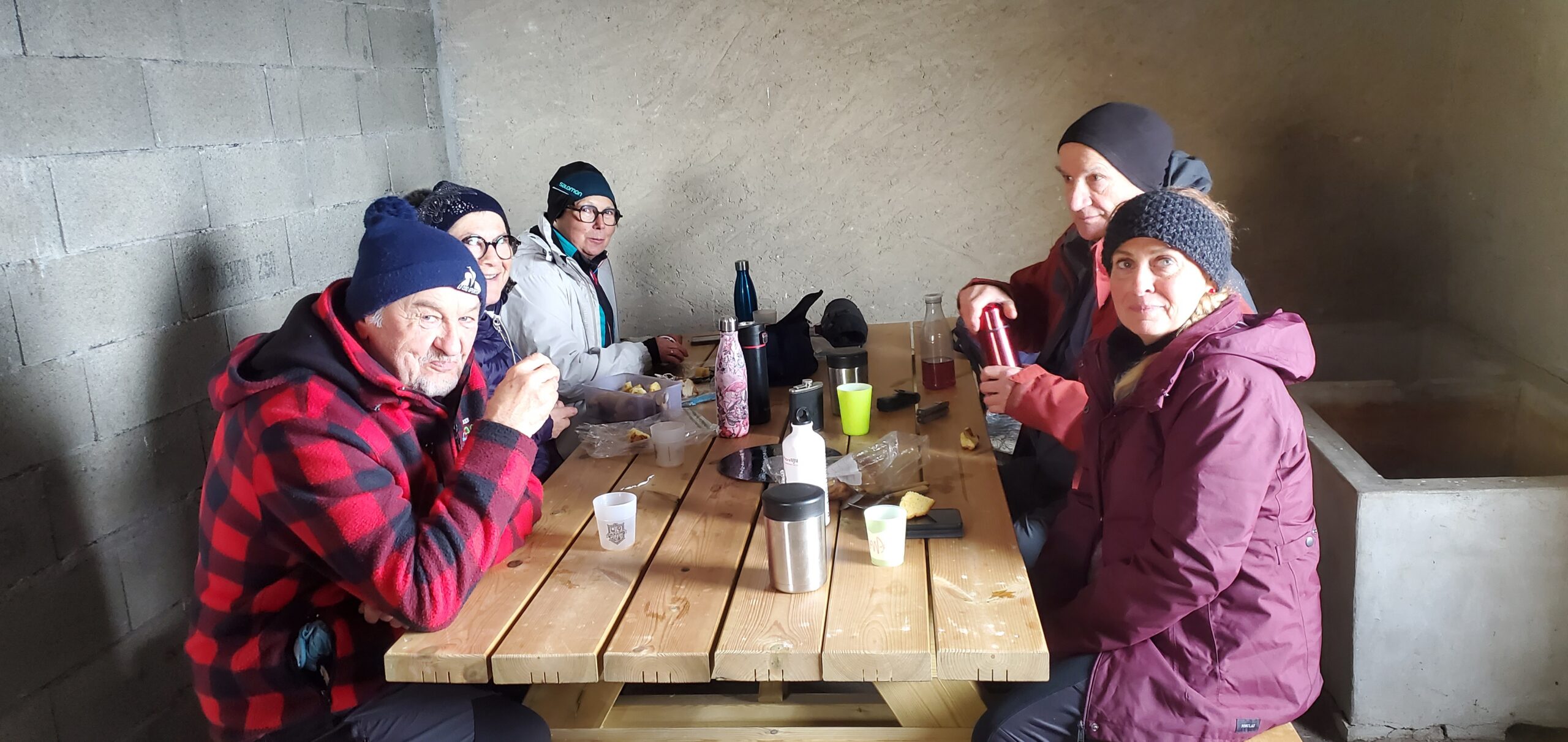 Pause pique-nique dans la salle hors sac de Lathuile où nous avons dégusté en apéritif truite et saumon fumé de Joseph arrosé de vin d’Auxerre et du champagne de Philippe, tout ceci avec modération mais pour la bonne cause puisque nous fêtions leurs anniversaires, gâteau de Joëlle et bougie de Brigitte pour compléter .