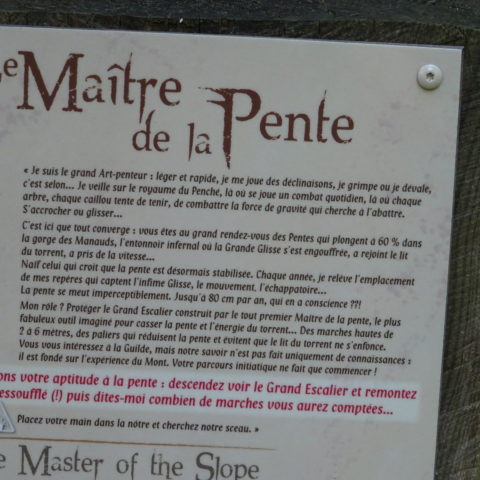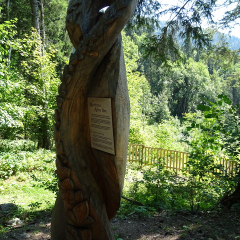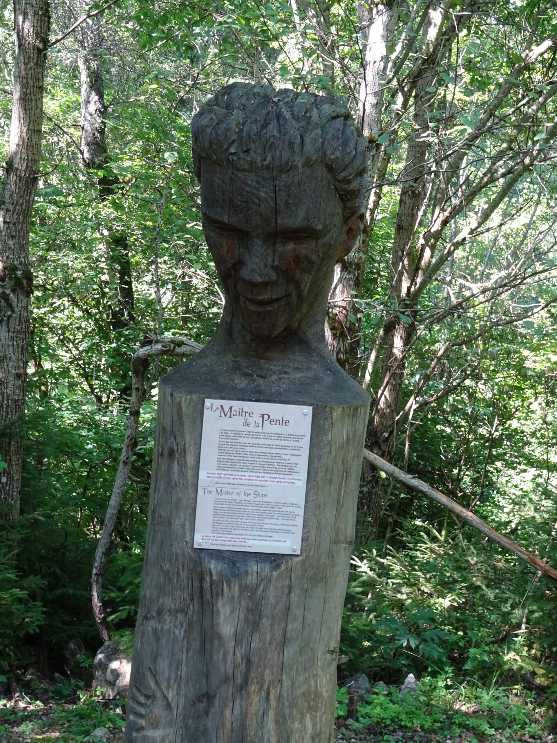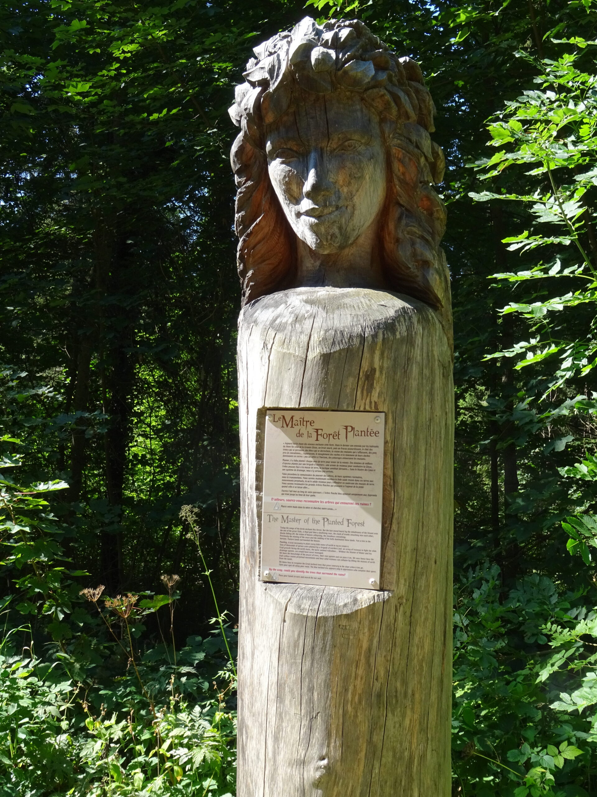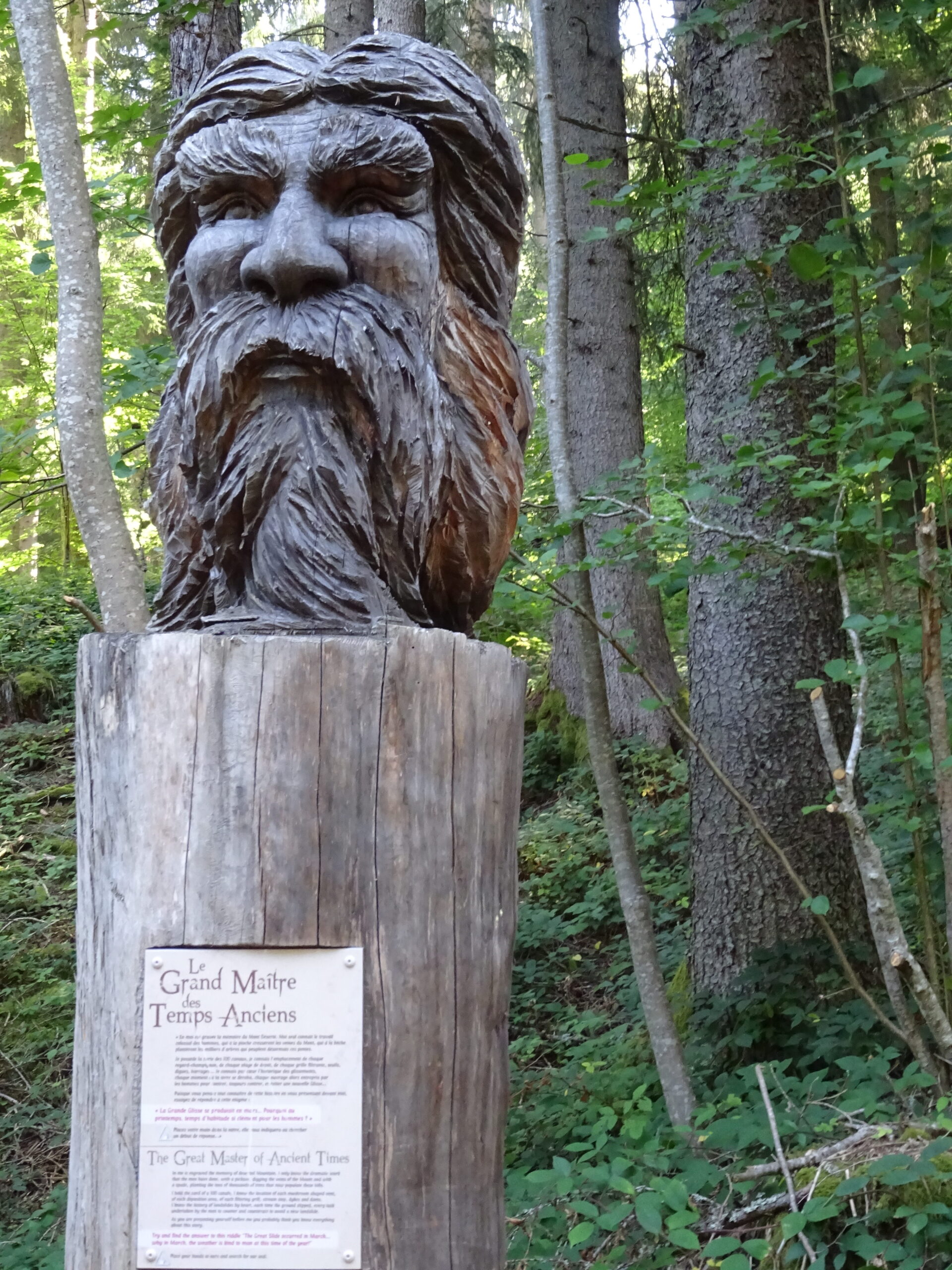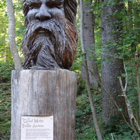 On commence à monter en voiture en direction du refuge des Garins. Au parking du dernier hameau, on finit à pied. On passe au-dessus de refuge et alors commence un itinéraire en zig-zag, on monte, on descend, on remonte, on redescend, pour faire le tour des « maitres » sculptures géantes en bois qui racontent les forces qui agitent ces lieux et l’énorme glissement de terrain qui a ravagé cette montagne.