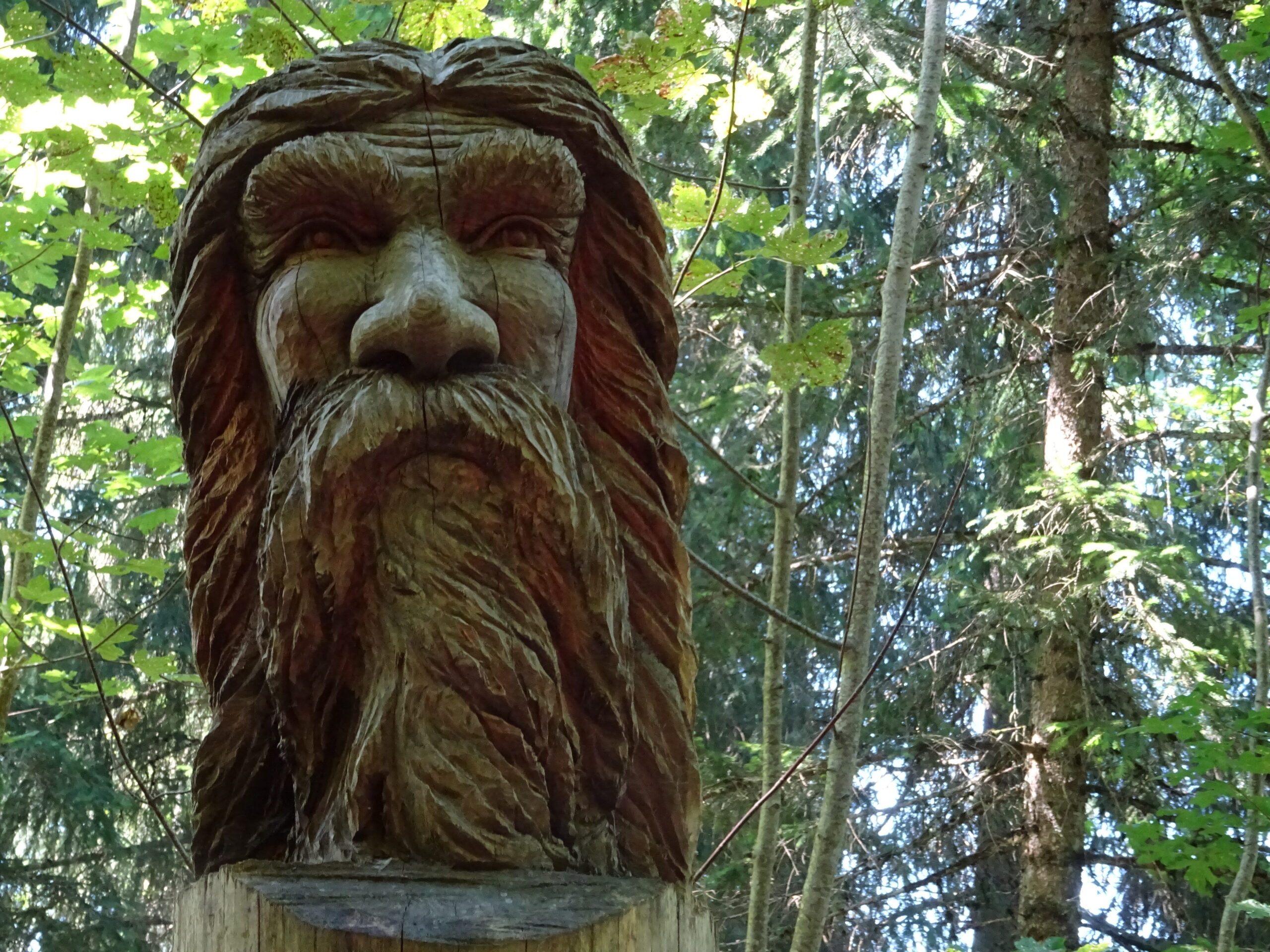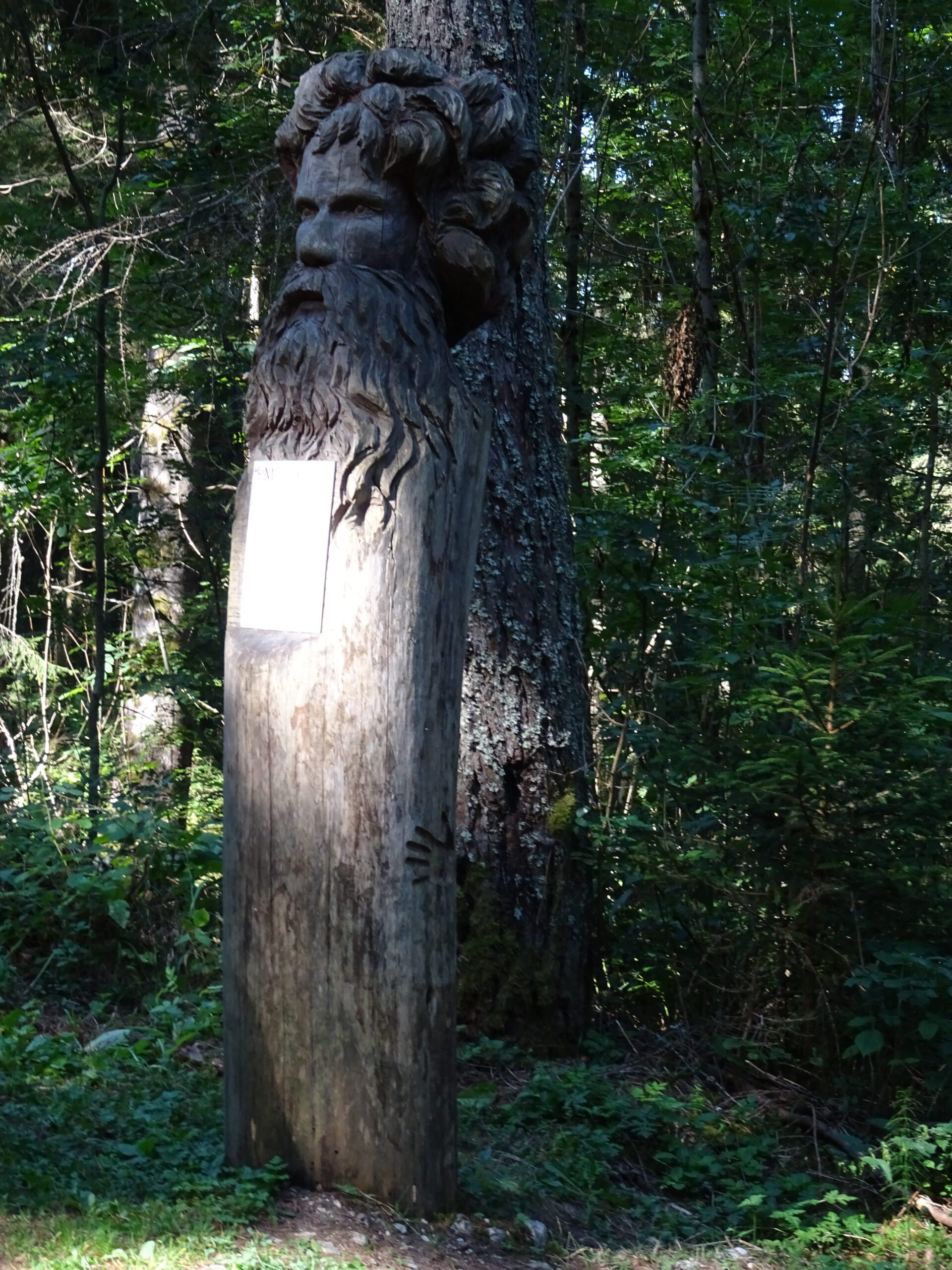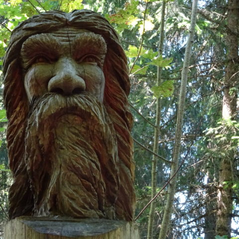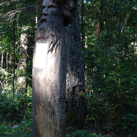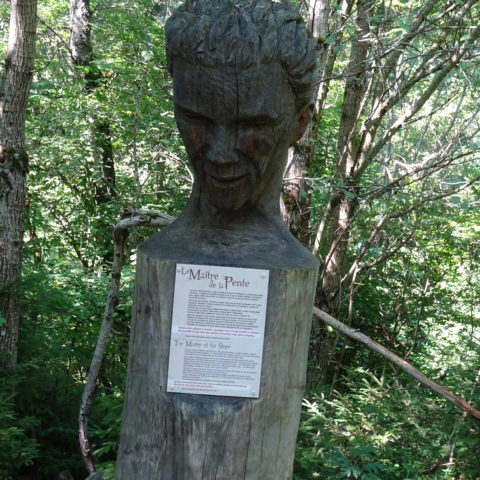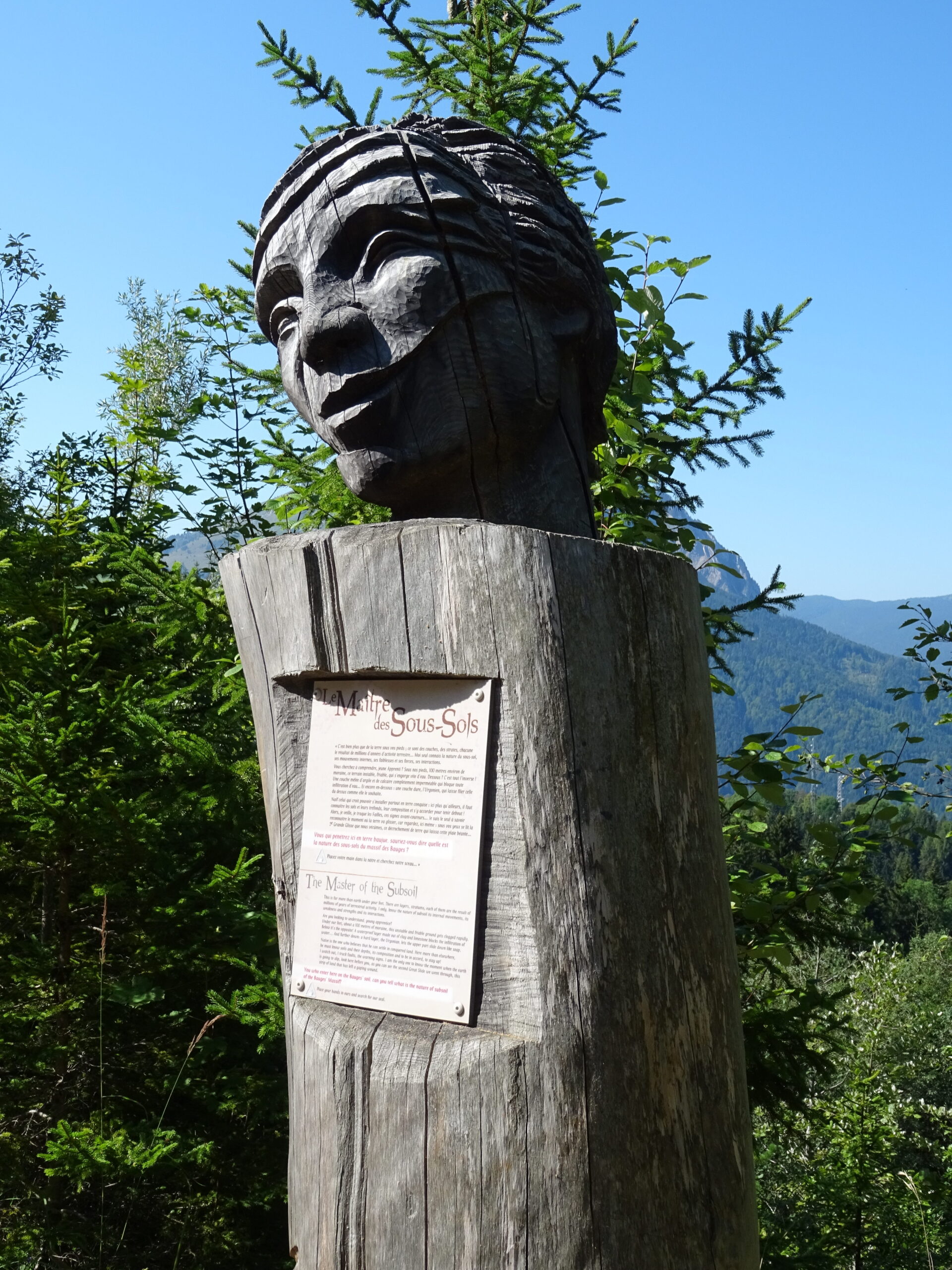 On commence à monter en voiture en direction du refuge des Garins. Au parking du dernier hameau, on finit à pied. On passe au-dessus de refuge et alors commence un itinéraire en zig-zag, on monte, on descend, on remonte, on redescend, pour faire le tour des « maitres » sculptures géantes en bois qui racontent les forces qui agitent ces lieux et l’énorme glissement de terrain qui a ravagé cette montagne.