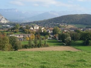 Destination du jour : Thusy et sa campagne environnante :st Eusèbe, Fresnes,  avec vues sur le val de fier, le Semnoz  , les massifs enneigés  en arrière plan,  le tout sous un soleil printanier