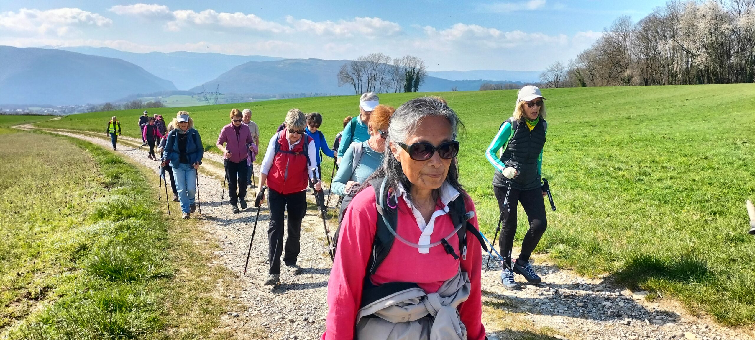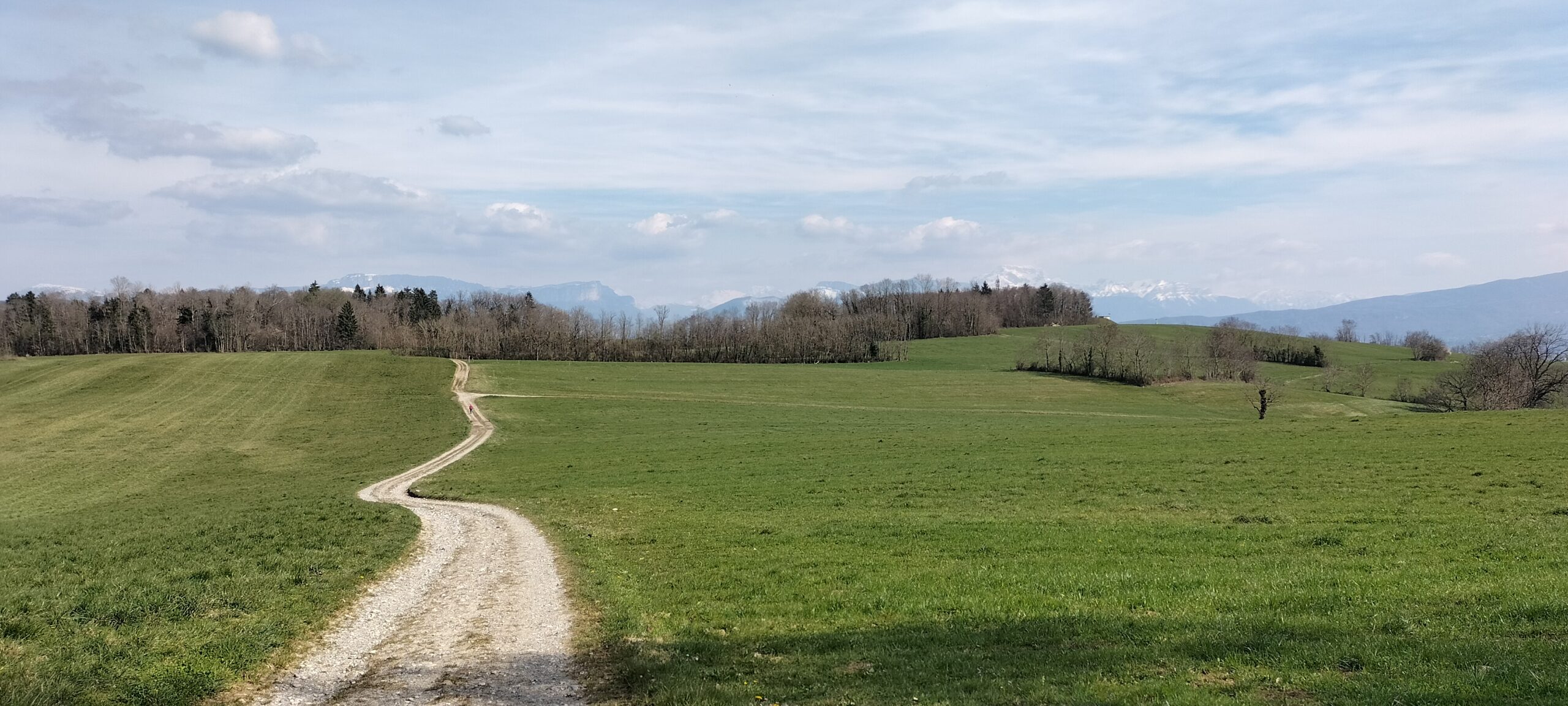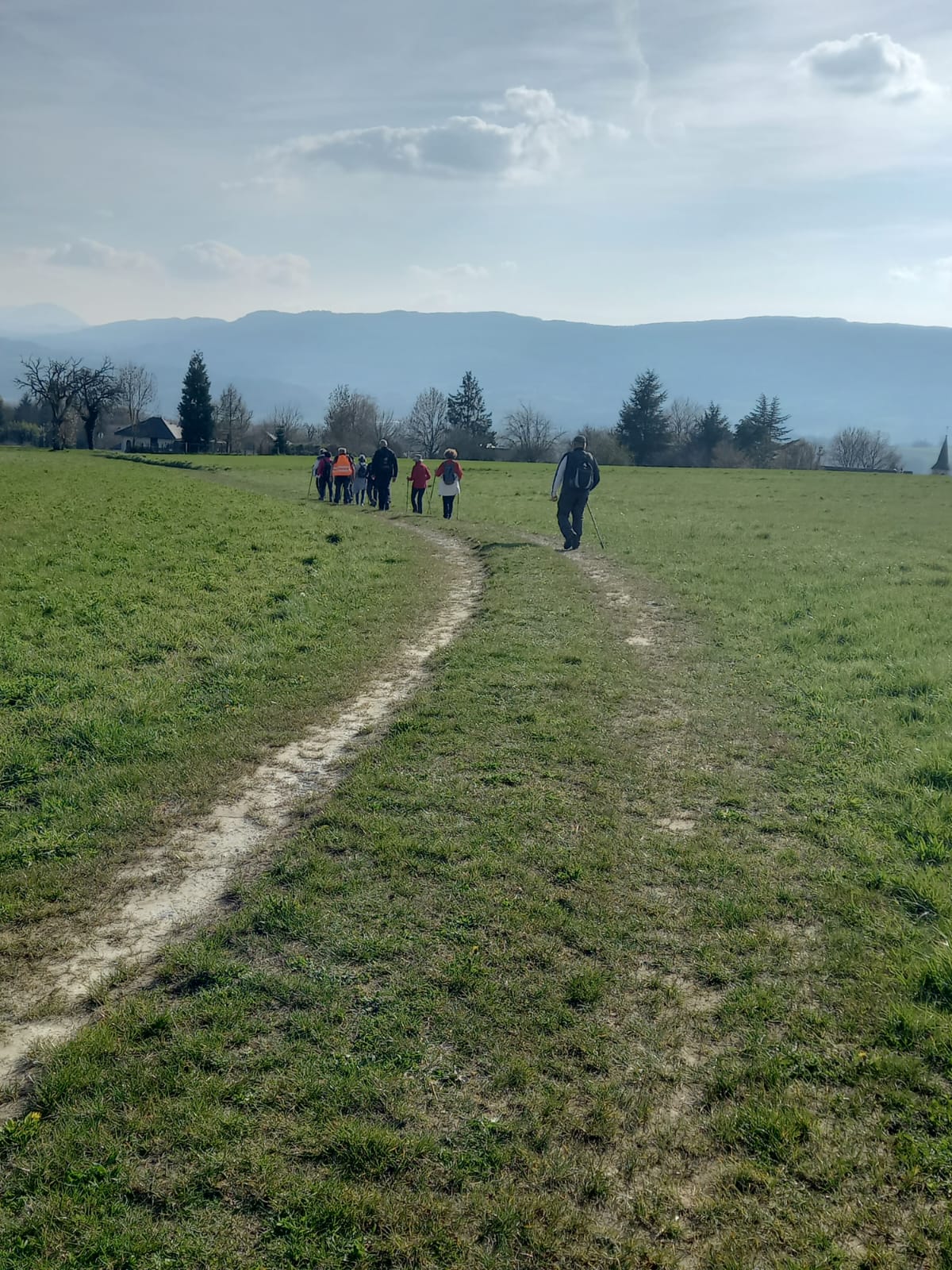 Destination du jour : Thusy et sa campagne environnante :st Eusèbe, Fresnes,  avec vues sur le val de fier, le Semnoz  , les massifs enneigés  en arrière plan,  le tout sous un soleil printanier
